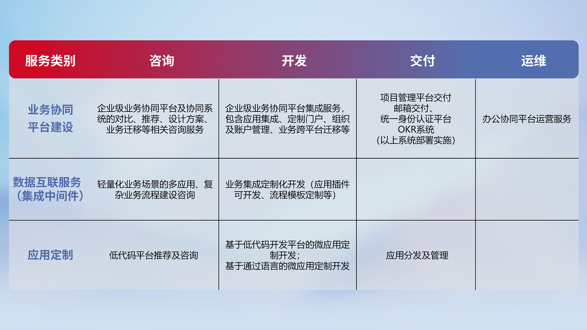 针对钉钉、、、企微、、、、IDaas等平台级产品提供产品的规划、、、方案、、交付、、、、定制化开发等服务,,实现如统一协同办公、、智能客户服务、、、、混合会议管理、、、智能数据查询、、、、等业务场景,,,,实现数字化转型。。。。